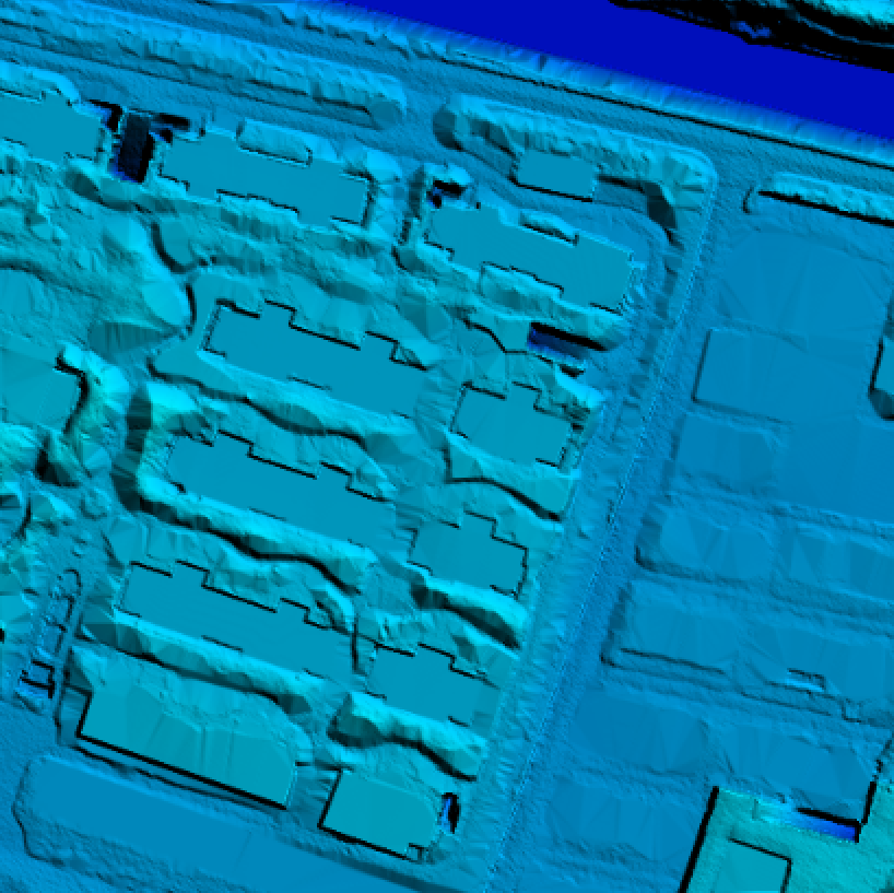 以分類點云中所有地表點以及地表之上的植被、建筑物、構筑物等自然及人工地物表面形態上的點均作為特征點,并以帶有高程信息的面狀水域范圍線作為特征線,構建并輸出數字表面模型(DSM)產品。