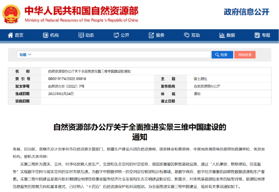2022年2月24日,自然資源部辦公廳印發了《關于全面推進實景三維中國建設的通知》。《通知》指出,實景三維作為真實、立體、時序化反映人類生產、生活和生態空間的時空信息,是國家重要的新型基礎設施,是數字政府、數字經濟重要的戰略性數據資源和生產要素。實景三維中國建設是面向新時期測繪地理信息事業服務經濟社會發展和生態文明建設新定位、新需求,對傳統基礎測繪業務的轉型升級,是測繪地理信息服務的發展方向和基本模式,已經納入“十四五”自然資源保護和利用規劃。